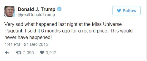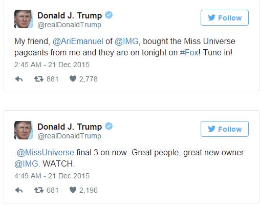 Αναλυτικά ο Τραμπ έγραψε αρχικά στο Twitter: ” O φίλος μου, Άρι Εμάνουελ, αγόρασε το διαγωνισμό” Μις Υφήλιος”από εμένα και σήμερα τα καλλιστεία μεταδίδονται στο κανάλι Fox! Συντονιστείτε!”