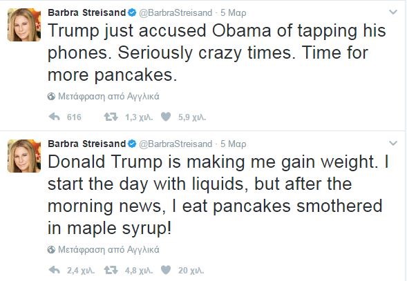 Η διάσημη καλλιτέχνιδα Μπάρμπρα Στρέιζαντ έχει παχύνει το τελευταίο διάστημα και γι’ αυτό κατηγορεί τον νέο Πρόεδρο των ΗΠΑ, Ντόναλντ Τραμπ.Η 75χρονη Αμερικανίδα ηθοποιός και τραγουδίστρια, η οποία φαίνεται ότι βρίσκει παρηγοριά στο φαγητό, έγραψε χαρακτηριστικά στον προσωπικό της λογαριασμό στο Twitter, κάνοντας χιούμορ:«Ο Ντόναλντ Τραμπ, με κάνει και παχαίνω. Ξεκινώ τη μέρα μου μόνο με υγρά, αλλά μετά τις πρωινές ειδήσεις τρώω ένα πιάτο τηγανίτες, βουτηγμένες σε σιρόπι σφενδάμου», ενώ σε μια άλλη ανάρτηση έγραψε:«Ο Τραμπ μόλις κατηγόρησε τον Ομπάμα ότι παρακολουθεί τα τηλέφωνά του. Ζούμε σε τρελούς καιρούς. Ώρα για περισσότερες τηγανίτες».Το Ιανουάριο, η Στρέιζαντ είχε υποστηρίξει ανοιχτά την Μέριλ Στριπ στην κόντρα της με τον Αμερικανό μεγιστάνα, χαρακτηρίζοντας τις ενέργειες του Προέδρου κατώτερες «της αξιοπρέπειας που οφείλει να έχει ένα άτομο στη θέση του».«Φαίνεται να έχει την ανάγκη να επιτεθεί και να προσβάλει οποιονδήποτε δεν συμφωνεί μαζί του και αυτό είναι αρκετά αναξιοπρεπές», είχε δηλώσει.Δείτε τις αναρτήσεις: