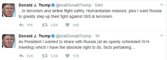 Μέσω αναρτήσεων στο Twitter, ο Τραμπ υποστήριξε ότι έχει το απόλυτο δικαίωμα να μοιράζεται δεδομένα με τη Ρωσία. «Ως πρόεδρος ήθελα να μοιραστώ με τη Ρωσία […] όπως έχω το απόλυτο δικαίωμα να πράξω, γεγονότα που άπτονται της τρομοκρατίας και της ασφάλειας των πτήσεων», ανέφερε ο Τραμπ, σε αναρτήσεις που έκανε στο Twitter.