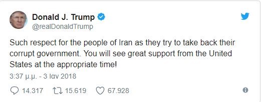 «Τεράστιος σεβασμός για τους Ιρανούς την ώρα που προσπαθούν να ξαναπάρουν τον έλεγχο από τη διεφθαρμένη κυβέρνησή τους. Θα δείτε μεγάλη υποστήριξη από τις Ηνωμένες Πολιτείες την κατάλληλη στιγμή!» έγραψε ο Τραμπ σε ανάρτησή του στο τουίτερ.