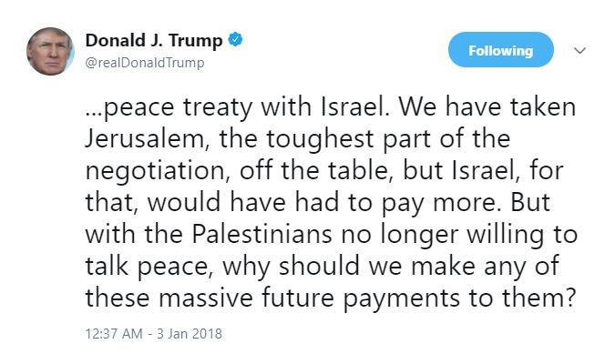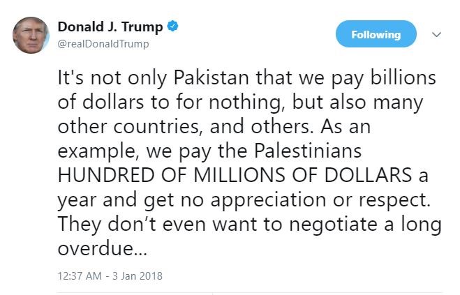 «Πληρώνουμε τους Παλαιστίνιους ΕΚΑΤΟΝΤΑΔΕΣ ΕΚΑΤΟΜΜΥΡΙΑ ΔΟΛΑΡΙΑ τον χρόνο, χωρίς καμία αναγνώριση ή σεβασμό εκ μέρους τους. Αφού οι Παλαιστίνιοι δεν θέλουν πια να μιλήσουν για την ειρήνη, γιατί οφείλουμε να συνεχίσουμε να τους κάνουμε αυτές τις τεράστιες πληρωμές στο μέλλον;» έγραψε στο Twitter ο Αμερικανός πρόεδρος.