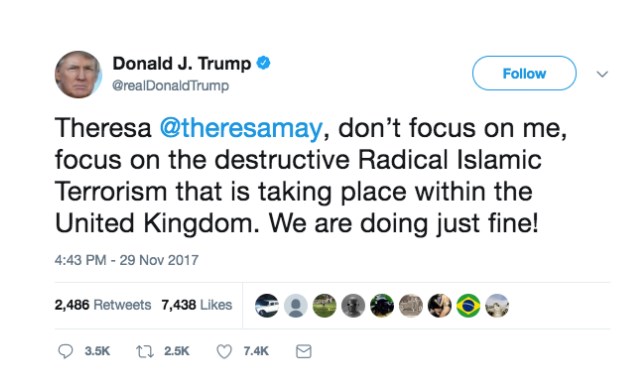 «Τερέζα @theresamay, μην επικεντρώνεσαι σε μένα, επικεντρώσου στην καταστροφική Ριζοσπαστική Ισλαμική Τρομοκρατία που λαμβάνει χώρα στο Ηνωμένο Βασίλειο. Εμείς τα πάμε μια χαρά», έγραψε ο Τραμπ σε tweet του.