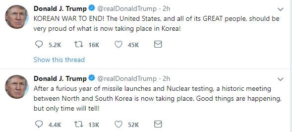 «Έπειτα από ένα τρελό έτος εκτοξεύσεων πυραύλων και πυρηνικών δοκιμών, μια ιστορική συνάντηση ανάμεσα στη Βόρεια και τη Νότια Κορέα πραγματοποιήθηκε. Θετικά πράγματα συμβαίνουν αλλά μόνο ο χρόνος θα επιτρέψει να κριθούν!» έγραψε στο τουίτερ ο Αμερικανός πρόεδρος.