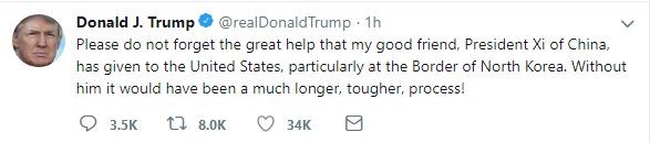 «Να μην ξεχάσουμε την πολύτιμη βοήθεια που ο φίλος μου, ο πρόεδρος Σι της Κίνας, προσέφερε στις Ηνωμένες Πολιτείες, ιδιαίτερα στα σύνορα με τη Βόρεια Κορέα. Χωρίς εκείνον, θα ήταν μια διαδικασία πολύ πιο μακρά και σκληρή», έγραψε σε ένα τουίτ ο Αμερικανός πρόεδρος.