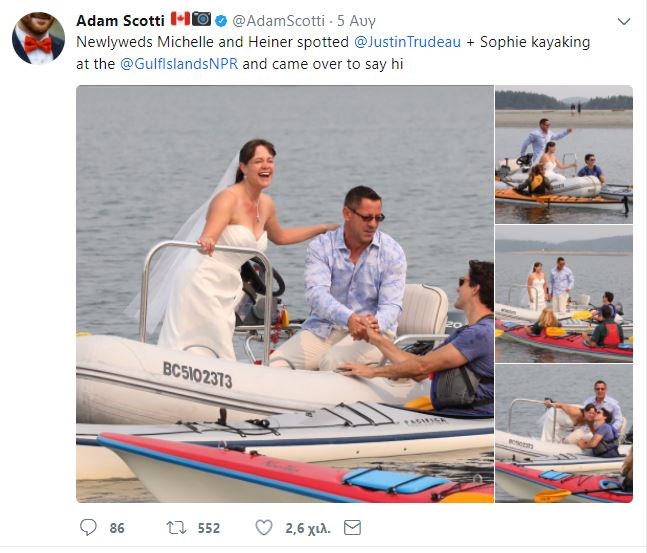 Ο προσωπικός φωτογράφους του Καναδού πρωθυπουργού Άνταμ Σκότι, ανέβασε στον λογαριασμό του στο twitter φωτογραφίες με τον Τριντό να προσεγγίζει τους νεόνυμφους με το κανό καγιάκ για τους ευχηθεί.