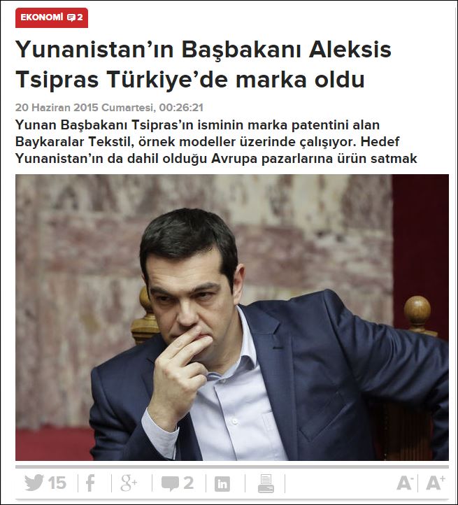 Τα δικαιώματα για το όνομα του Αλέξη Τσίπρα ως brand name αγόρασε μία εταιρεία στην Τουρκία, σύμφωνα με δημοσίευμα της εφημερίδας Haber Turk.