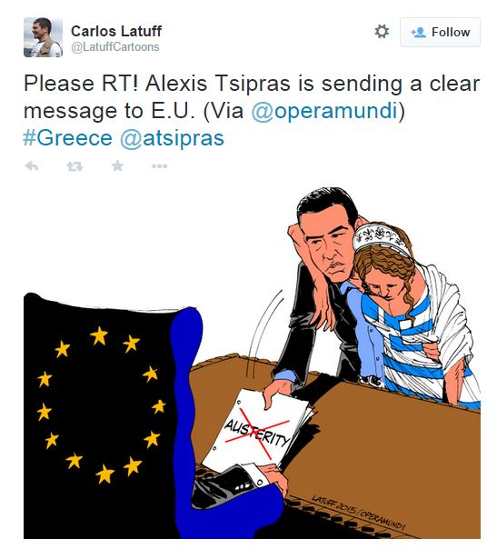 Στο σκίτσο εικονίζεται ο Πρωθυπουργός, Αλέξης Τσίπρας, να δίνει σε έναν Ευρωπαίο αξιωματούχο ένα έγγραφο στο οποίο αναγράφεται η λέξη λιτότητα, σβησμένη όμως με ένα Χ.