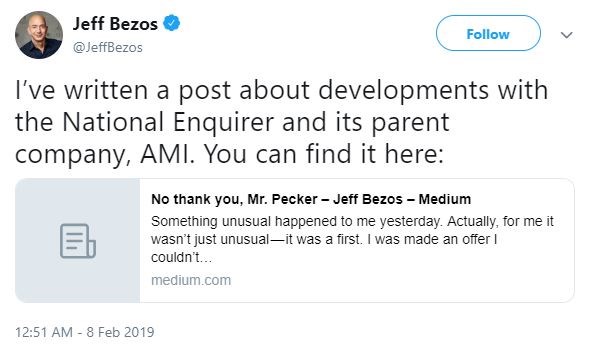Σε ανάρτησή του χθες στον ιστότοπο Medium ο Μπέζος κατήγγειλε ότι έλαβε ένα e-mail από εκπροσώπους της ΑΜΙ οι οποίοι τον απειλούσαν να δημοσιεύσουν «προσωπικές φωτογραφίες» του ίδιου με την ερωμένη του, την πρώην παρουσιάστρια της τηλεόρασης Λόρεν Σάντσες.