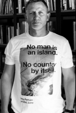 Ο ηθοποιός που υποδύθηκε τον Τζέιμς Μποντ στις τελευταίες ταινίες, ποζάρει στον φωτογραφικό φακό με μια μπλούζα που γράφει: «Κανείς άνθρωπος δεν είναι νησί, καμία χώρα μόνη της» και στο τέλος το μήνυμα: «Ψηφίστε παραμονή στις 23 Ιουνίου».