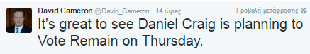 Τη φωτογραφία δημοσίευσε στον λογαριασμό του στο twitter o βρετανός πρωθυπουργός, Ντέιβιντ Κάμερον γράφοντας: «Είναι υπέροχο να βλέπεις τον Ντάνιελ Κρεγκ να σχεδιάζει να ψηφίσει υπέρ της παραμονής την Πέμπτη».