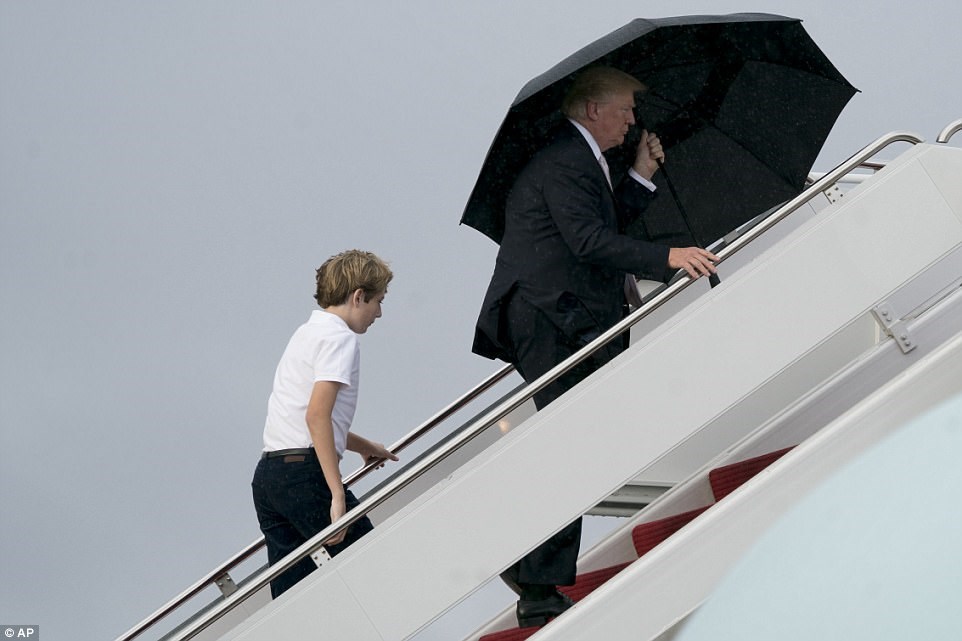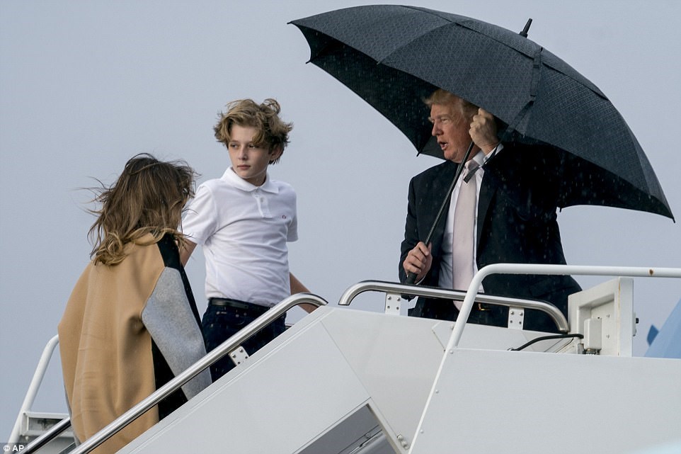 Ο μικρός Μπάρον αποδείχθηκε πιο τζέντλεμαν από τον πατέρα του, καθώς περίμενε κάτω από τη βροχή, μέχρι να ανέβει πρώτη η μητέρα του στο Air Force One και να πετάξουν για την Ουάσινγκτον.