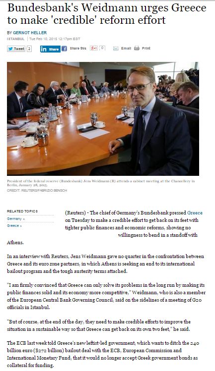 Ο Γενς Βάιντμαν, ο επικεφαλής της Μπούντεσμπανκ, ενέτεινε την πίεση που ασκείται στην Ελλάδα να καταβάλει προσπάθειες να ανακάμψει οικονομικά προωθώντας αυστηρότερη δημοσιονομική πολιτική και διαρθρωτικές μεταρρυθμίσεις, δείχνοντας ότι δεν προτίθεται να μεταβάλει τη στάση του έναντι της Αθήνας, σε μια συνέντευξη που παραχώρησε σήμερα στο πρακτορείο ειδήσεων Reuters.