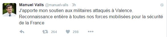 Ο Πρωθυπουργός της Γαλλίας Μανουέλ Βαλς σχολίασε στον λογαριασμό του στο Twitter την επίθεση που δέχτηκαν στρατιώτες στο τέμενος της Βαλάνς, στη νοτιοανατολική Γαλλία, όταν ένας άνδρας προσπάθησε να οδηγήσει το αυτοκίνητό του πάνω τους.