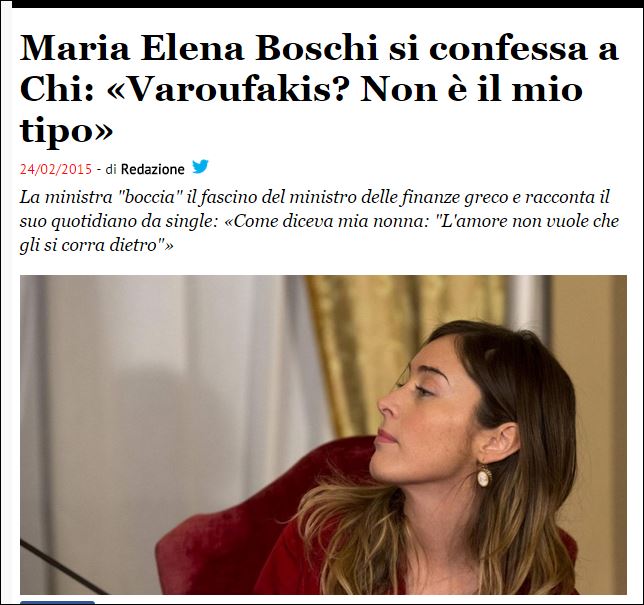 Τα Μέσα Μαζικής Ενημέρωσης αναφέρονται καθημερινά στον υπουργό Οικονομικών. Σήμερα, το ιταλικό περιοδικό Chi ρώτησε την υπουργό Μεταρρυθμίσεων, Μαρία Έλενα Μπόσκι: «Ο Έλληνας υπουργός Οικονομικών θεωρείται σύμβολο του σεξ. Πιστεύετε ότι μπορεί να ανταπεξέλθει στα καθήκοντα του υπουργού;». Και εκείνη απάντησε: «Δεν είναι ο τύπος μου».