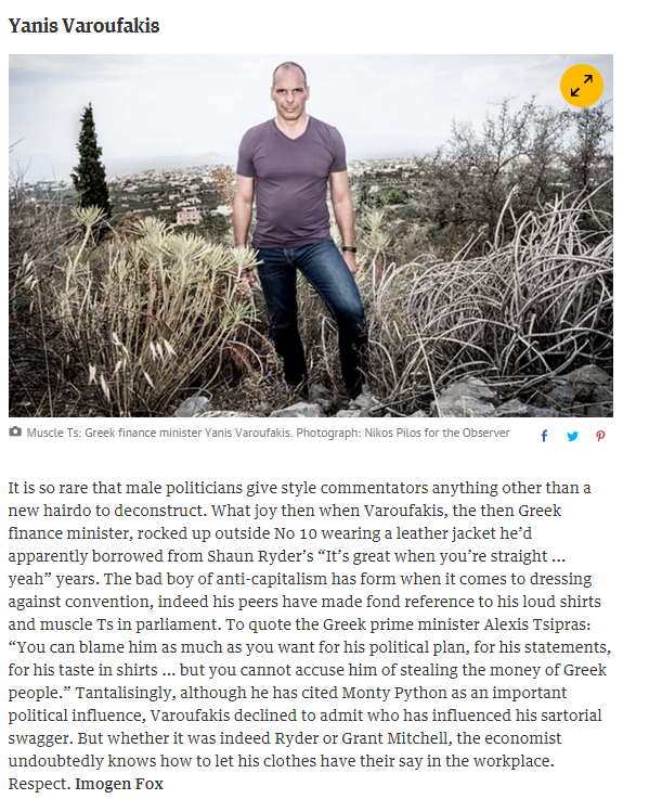 Ανασκόπηση στη χρονιά που φεύγει κάνει η βρετανική εφημερίδα The Guardian, κάνοντας αφιερώματα στους ανθρώπους που διαμόρφωσαν τη μόδα. Στη λίστα του “Style Icon” για το 2015 περιλαμβάνεται και ο Έλληνας πρώην υπουργός Οικονομικών Γιάνης Βαρουφάκης, το ντύσιμο του οποίου, μέσα στο 2015, σχολιάστηκε πιο πολύ από οποιονδήποτε άλλο πολιτικό.