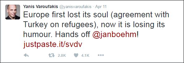 Στο πλευρό του σατιρικού παρουσιαστή τάχθηκε μέσω twitter και ο Γιάνης Βαρουφάκης ο οποίος έγραψε «Europe first lost its soul (agreement with Turkey on refugees), now it is losing its humour. Hands off @janboehm!» (Η Ευρώπη αρχικά έχασε την ψυχή της –συμφωνία με την Τουρκία για τους πρόσφυγες-, τώρα χάνει το χιούμορ της. Κάτω τα χέρια από τον Γιαν Μπέμερμαν!).