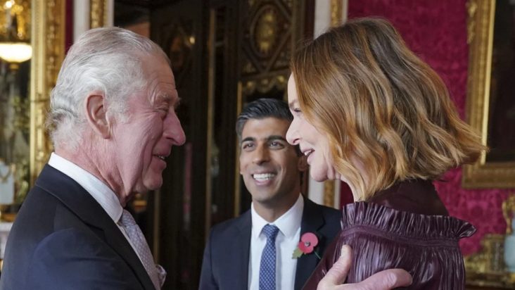Παρουσία του νέου πρωθυπουργού Ρίσι Σούνακ, ο βασιλιάς Κάρολος καλωσόρισε τη σχεδιάστρια μόδας, Στέλλα Μακ Κάρντεϊ, φιλώντας την σταυρωτά, αγκαλιάζοντας την παράλληλα.