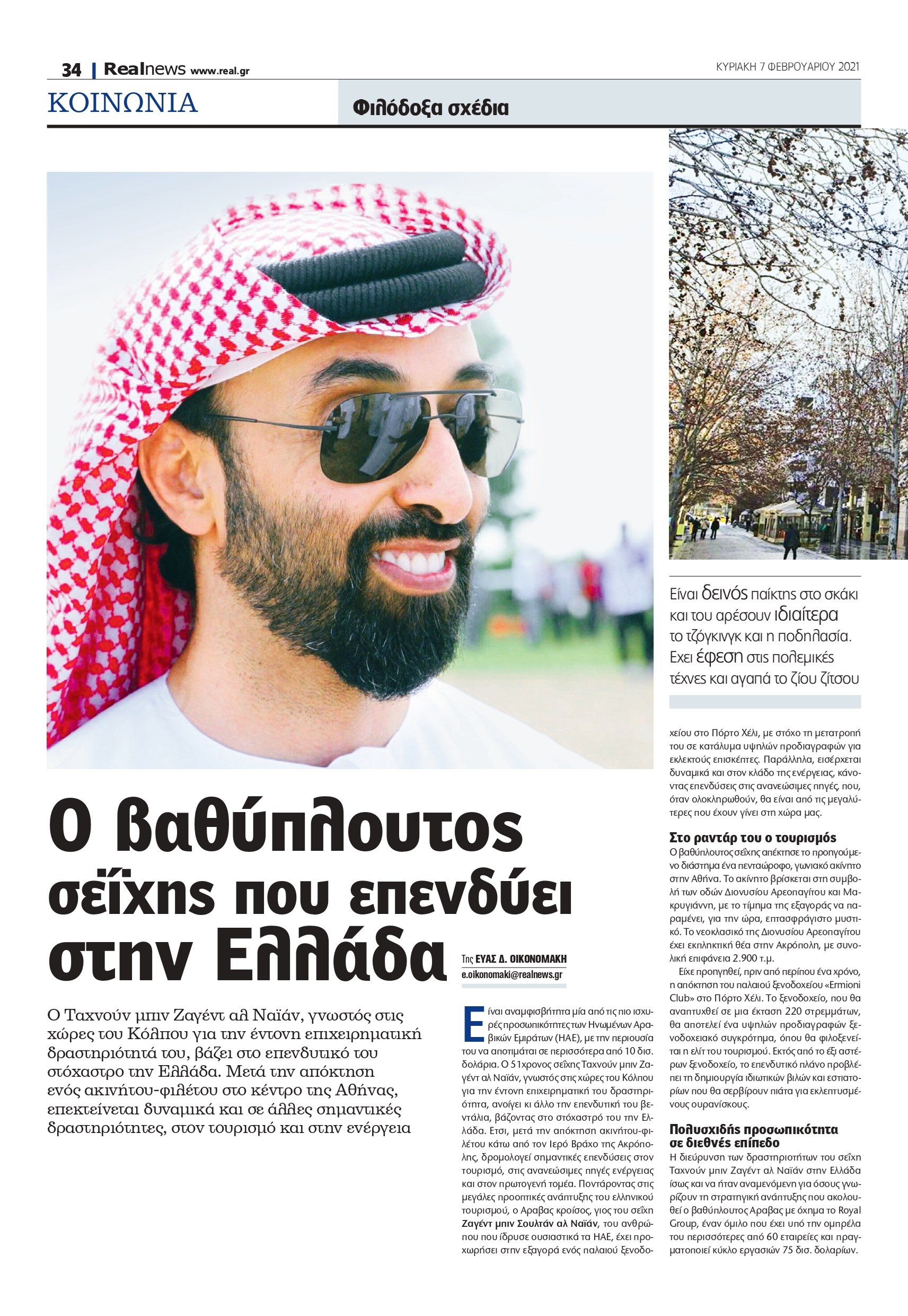Ετσι, μετά την απόκτηση ακινήτου-φιλέτου κάτω από τον Ιερό Βράχο της Ακρόπολης, δρομολογεί σημαντικές επενδύσεις στον τουρισμό, στις ανανεώσιμες πηγές ενέργειας και στον πρωτογενή τομέα. Ποντάροντας στις μεγάλες προοπτικές ανάπτυξης του ελληνικού τουρισμού, ο Αραβας κροίσος, γιος του σεΐχη Ζαγέντ μπιν Σουλτάν αλ Ναϊάν, του ανθρώπου που ίδρυσε ουσιαστικά τα ΗΑΕ, έχει προχωρήσει στην εξαγορά ενός παλαιού ξενοδοχείου στο Πόρτο Χέλι, με στόχο τη μετατροπή του σε κατάλυμα υψηλών προδιαγραφών για εκλεκτούς επισκέπτες. Παράλληλα, εισέρχεται δυναμικά και στον κλάδο της ενέργειας, κάνοντας επενδύσεις στις ανανεώσιμες πηγές, που, όταν ολοκληρωθούν, θα είναι από τις μεγαλύτερες που έχουν γίνει στη χώρα μας.