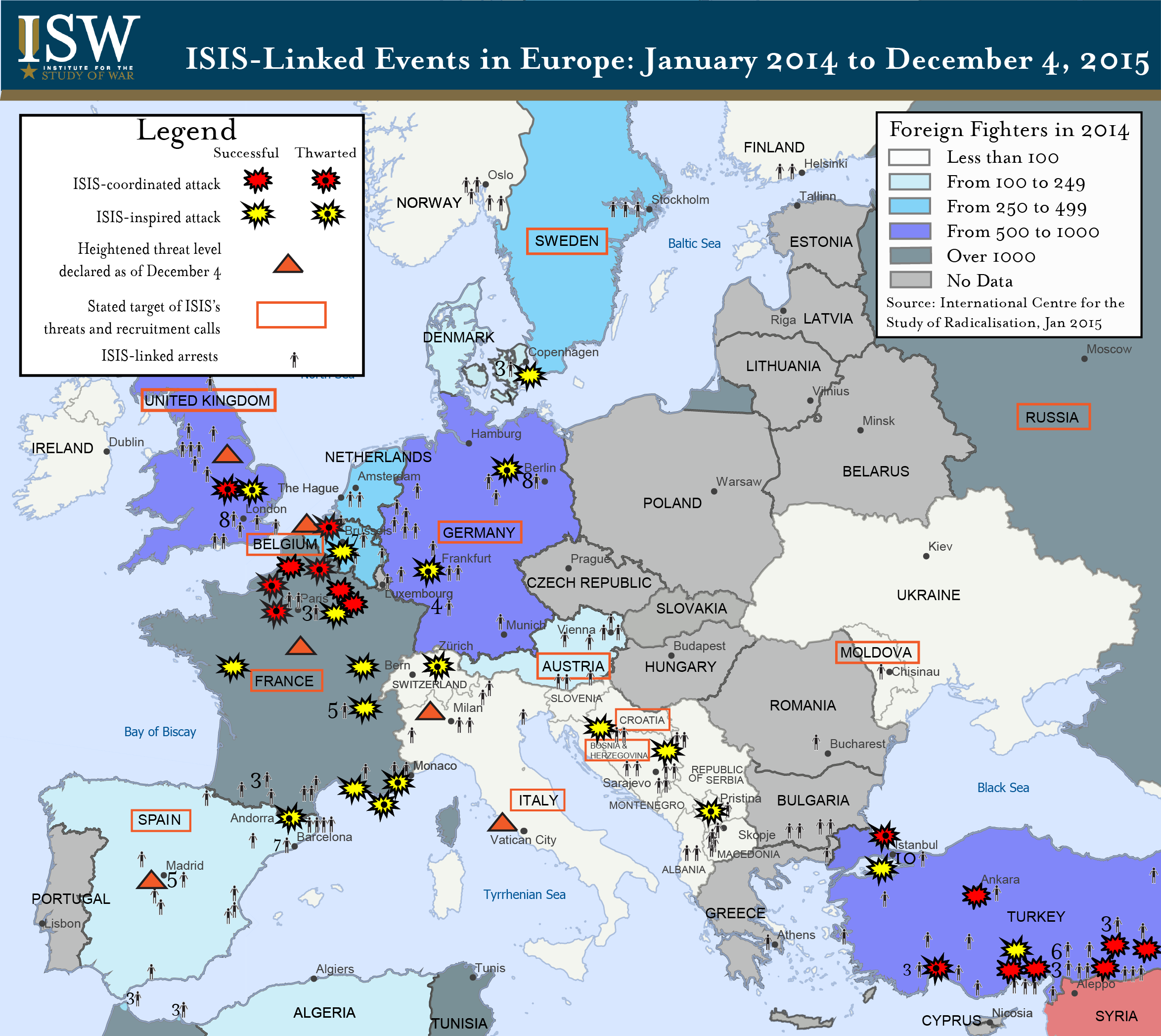 Ο χάρτης του Ινστιτούτο Μελετών Πολέμου δείχνει ότι το Ισλαμικό Κράτος είναι ιδιαίτερα δραστήριο με επιθέσεις στη Γαλλία και την Τουρκία. Επίσης, οι Γαλλία, Ρωσία, Γερμανία και Βρετανία είναι οι βασικές «δεξαμενές» ξένων μαχητών.