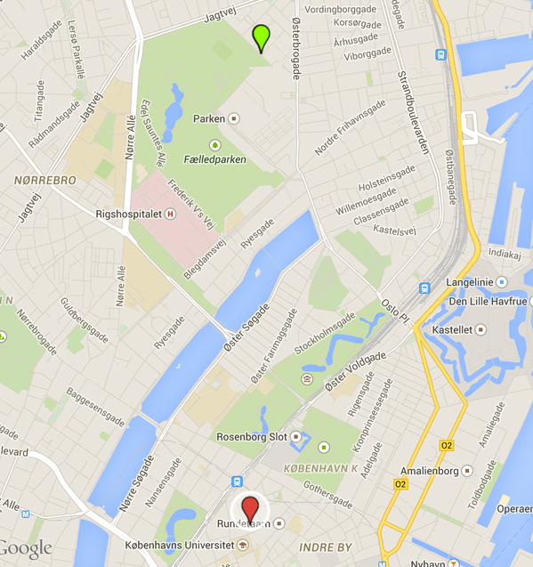 Με την πράσινη τελεία είναι το Krudttønden, ενώ η κόκκινη τελεία είναι η συναγωγή στην Krystalgade.