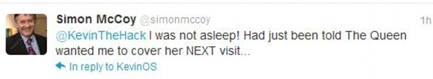 Τα δημοσιογραφικά καθήκοντα δεν τον απέτρεψαν να πάρει έναν υπνάκο! Ο λόγος για τον παρουσιαστή του BBC, Σάιμον Μακ Κόι, ο οποίος έγειρε μπροστά στο γραφείο του, πάνω στα χέρια του και αποκοιμήθηκε για λίγα λεπτά, μέχρι να ξεκινήσει η εκπομπή του. Μόλις συνειδητοποίησε ότι η εκπομπή ξεκίνησε, κοίταξε έκπληκτος προς τις κάμερες και προσπάθησε να μείνει ψύχραιμος.Δυστυχώς όμως, οι τηλεθεατές τον κατάλαβαν και αμέσως σχολίασαν τον υπναρά παρουσιαστή στο twitter.Εκείνος προσπάθησε, μέσω twitter να δικαιολογηθεί γράφοντας : ” Δεν ήμουν κοιμισμένος. Μόλις μου είχαν πει ότι πρέπει να καλύψω την επόμενη επίσκεψη της Βασίλισσας!”