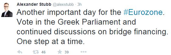 Σε ανάρτηση του στο twitter, o υπουργός Οικονομικών της Φινλανδίας, Αλεξάντερ Στούμπ, χαρακτηρίζει σημαντική, τη σημερινή ημέρα για την Ευρωζώνη, λόγω της ψηφοφορίας στην ελληνική Βουλή και προσθέτει «Ένα βήμα τη φορά»: