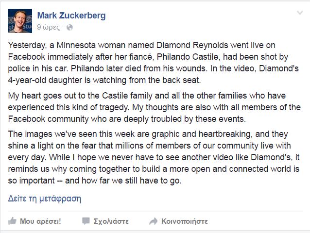 Ο ιδρυτής του Facebook, Μαρκ Ζούκερμπεργκ, με ανάρτηση στην προσωπική του σελίδα στο δημοφιλές μέσο κοινωνικής δικτύωσης, σχολίασε το βίντεο που ανέβασε ζωντανά στο facebook, η Ντάιαμοντ Ρέινολντς, στο οποίο απεικονίζεται ο σύντροφος της να φεύγει από τη ζωή, μετά τα πυρά των αστυνομικών, κατά τη διάρκεια τυπικού έλεγχου στο αυτοκίνητο του.