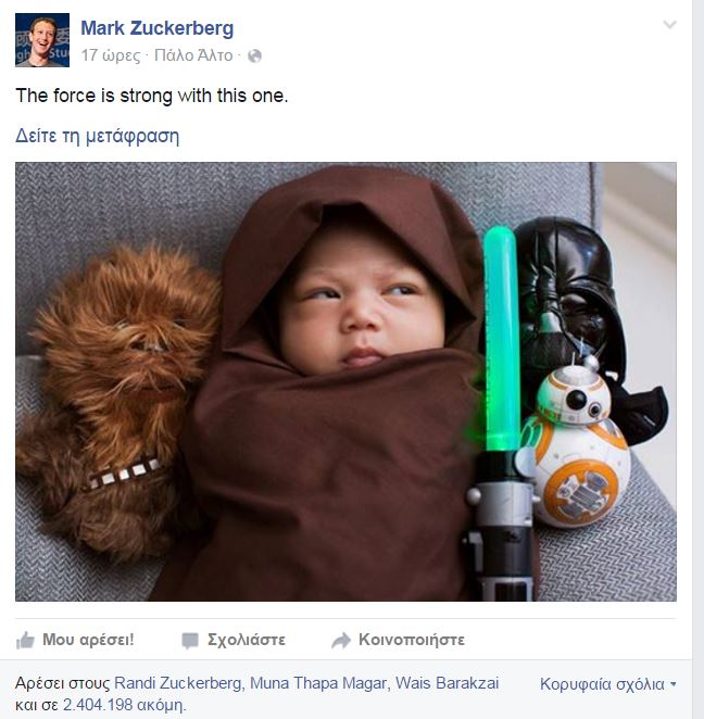 Αυτό ακριβώς έκανε και το “αφεντικό” του Facebook Mark Zuckerberg o oποίος ανέβασε φωτογραφιά της νεογέννητης κόρης του την οποία έντυσε Τζεντάι, με αφορμή τη νέα ταινία “Star Wars: The Force Awakens”.