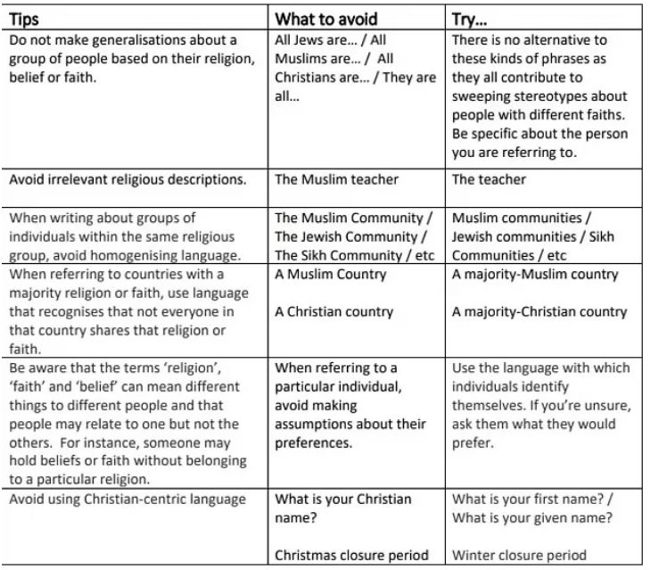 Το έγγραφο που μοιράστηκε στους υπαλλήλους έφερε στο φως η Daily Mail και περιέχει λέξεις και φράσεις οι οποίες θα πρέπει να αποφεύγονται προς σεβασμό των Μουσουλμάνων συναδέλφων τους αλλά και μαθητών. Μάλιστα δίνονται και εναλλακτικές, όπως για παράδειγμα δεν λέμε «κλείσιμο για τα Χριστούγεννα» αλλά «χειμερινή περίοδος κλεισίματος».
