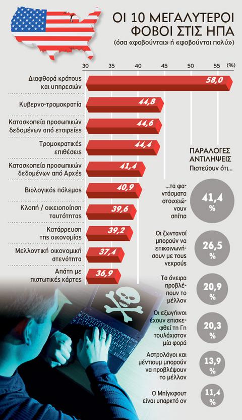 Ο μεγαλύτερος ωστόσο αμερικανικός φόβος σε ποσοστό 58% είναι η κυβερνητική διαφθορά, ενώ το 45% απάντησε ότι αυτό που φοβάται περισσότερο είναι η κυβερνο-τρομοκρατία. Την τριάδα συμπληρώνει ο φόβος για την εταιρική ανίχνευση προσωπικών πληροφοριών σε ποσοστό 44,6% κι όπως επισημαίνει ο Κρίστοφερ Μπάντερ, επικεφαλής των ερευνητών, ζητήματα παρακολούθησης αλά… Big Brother κυριαρχούν στη λίστα, καθώς «οι άνθρωποι συχνά φοβούνται ό,τι δεν μπορούν να ελέγξουν».
