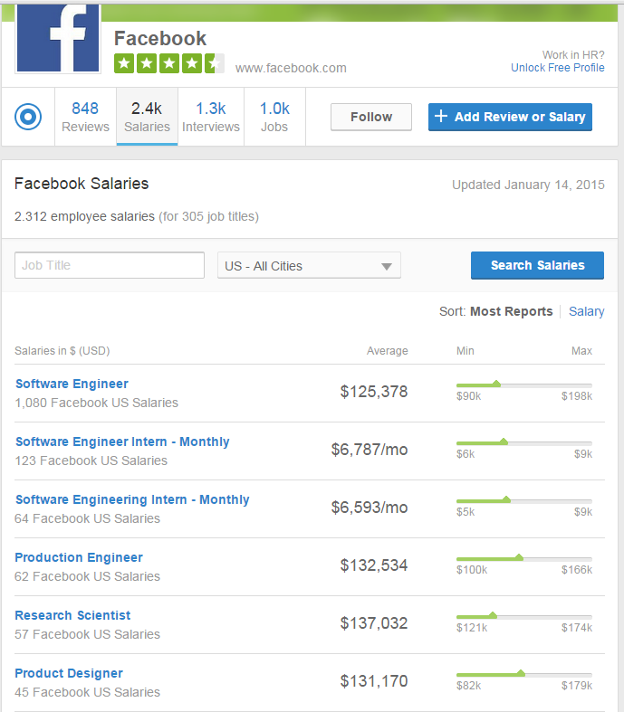 Οι ερευνητές λαμβάνουν 172.705 δολάρια τον χρόνο, ενώ ο μέσος μηχανικός δικτύου βγάζει 160.172 δολάρια. Άλλωστε είναι γνωστό ότι οι νέοι που επιλέγουν το facebook για την πρακτική τους άσκηση, αμείβονται με μισθούς που ξεπερνούν τις 5.000 ευρώ το μήνα.
