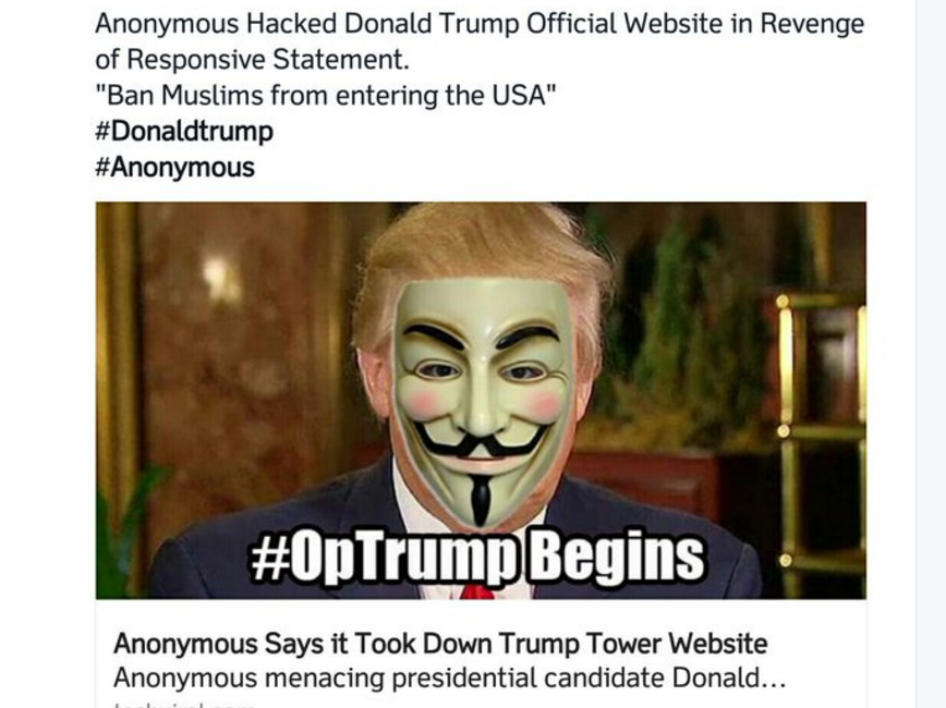 Στο στόχαστρο των Anonymous μπήκε η σελίδα του υποψήφιου προέδρου των ΗΠΑ, Ντόναλντ Τραμπ με αφορμή τις ρατσιστικές δηλώσεις του για τους μουσουλμάνους πρόσφυγες.