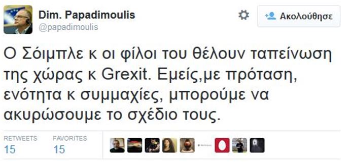 «Ο Σόιμπλε κ οι φίλοι του θέλουν ταπείνωση της χώρας κ Grexit. Εμείς, με πρόταση, ενότητα κ συμμαχίες, μπορούμε να ακυρώσουμε το σχέδιο τους», έγραψε στο twitter o βουλευτής του ΣΥΡΙΖΑ και αντιπρόεδρος του Ευρωπαϊκού Κοινοβουλίου, Δημήτρης Παπαδημούλης.