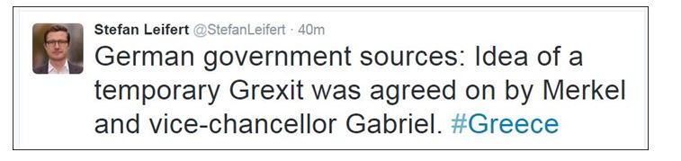 Ο Γερμανός δημοσιογράφος του τηλεοπτικού σταθμού ZDF, Στέφαν Λάιφερτ, ανέφερε σε tweet του ότι η πρόταση για «πενταετές Grexit», συμφωνήθηκε από την Γερμανίδα καγκελάριο, Άνγκελα Μέρκελ, και τον αντικαγκελάριο της Γερμανίας, Ζίγκμαρ Γκάμπριελ.