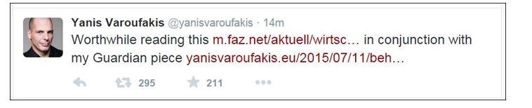 «Αξίζει να διαβάσει κανείς αυτό faz.net/aktuell/… σε συνδυασμό με το άρθρο μου στον Guardian yanisvaroufakis.eu/2015/07/11/…»