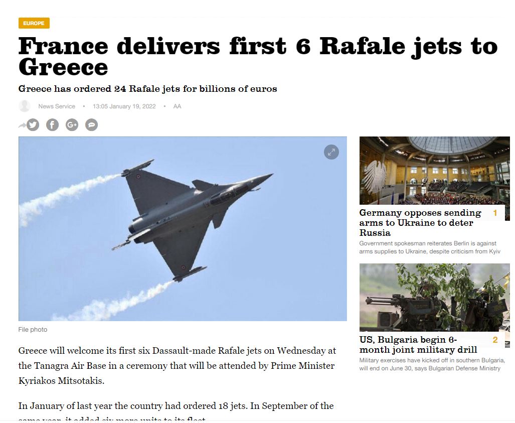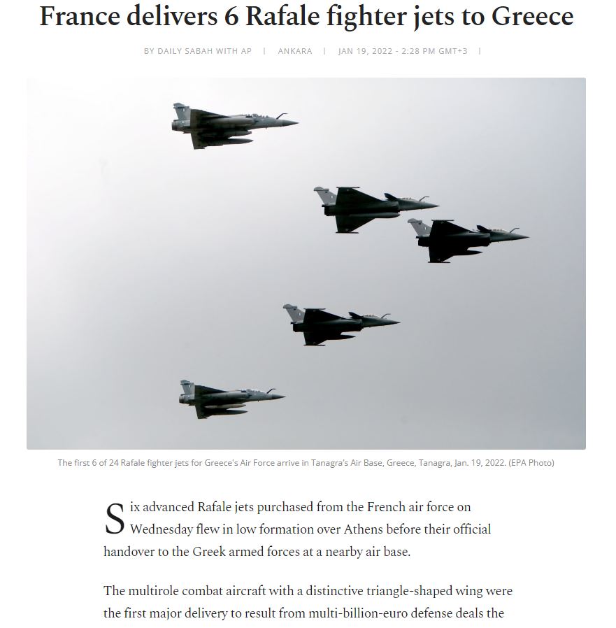 H Yeni Safak στην αγγλική έκδοσή της αναφέρει “η Ελλάδα υποδέχεται τα πρώτα έξι Rafale μαχητικά την Τετάρτη στην Αεροπορική Βάση της Τανάγρας, σε μια τελετή που θα παραστεί ο Πρωθυπουργός Κυριάκος Μητσοτάκης. Τον Ιανουάριο πέρυσι η χώρα είχε παραγγείλει 18 μαχητικά. Τον Σεπτέμβριο του ίδιου έτους πρόσθεσε άλλα έξι στον στόλο της” και σε άλλο σημείο τονίζει ότι η “Ελλάδα επιδιώκει να ενισχύσει την αμυντική της ικανότητα με την απόκτηση ακόμη τριών γαλλικών φρεγατών Belhara που θα παραδοθούν το 2025 και το 2026”.