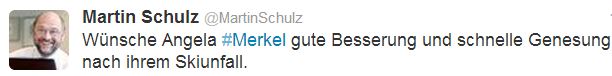 «Εύχομαι στην Άνγκελα Μέρκελ γρήγορη ανάρρωση μετά από το ατύχημα που είχε κάνοντας σκι», έγραψε ο Μάρτιν Σουλτς.