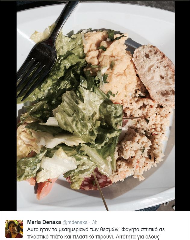 «Αυτό ήταν το μεσημεριανό των θεσμών. Φαγητό σπιτικό σε πλαστικό πιάτο και πλαστικό πιρούνι. Λιτότητα για όλους», σχολίασε η δημοσιογράφος.