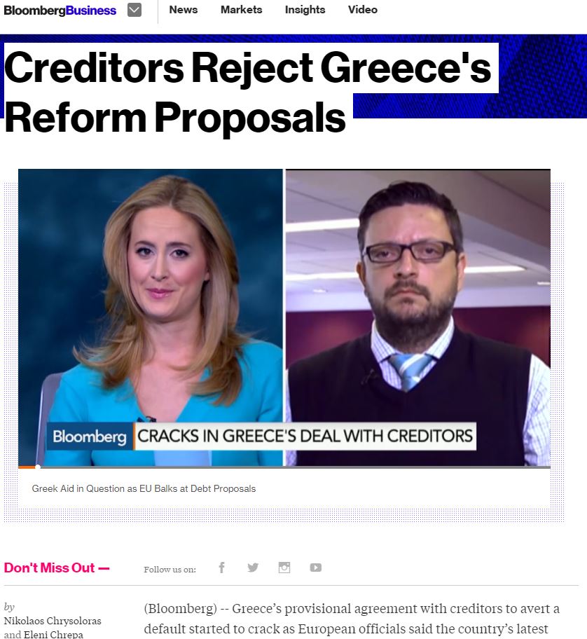 Στο ειδησεογραφικό πρακτορείο Bloomberg επισημαίνεται ότι «η προσωρινή συμφωνία της Ελλάδας με τους διεθνείς εταίρους της άρχισε να υφίσταται ρωγμές, καθώς Ευρωπαίοι αξιωματούχοι δήλωσαν ότι οι τελευταίες ελληνικές προτάσεις υπολείπονται των αντιστοίχων που προηγήθηκαν πριν από δύο εβδομάδες, ενώ ήδη από Έλληνες υπουργούς άρχισε να ακούγεται η πρόταση για δημοψήφισμα σε περίπτωση που τελικά οι προτάσεις απορριφθούν».