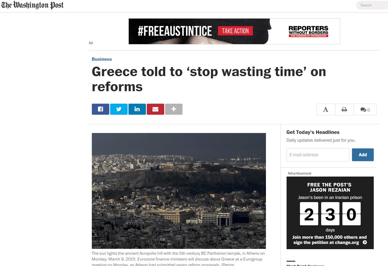 Στην εφημερίδα Washington Post δημοσιεύεται ανταπόκριση του Associated Press στην οποία καταγράφεται αναφορά του διοικητή της Τράπεζας της Ελλάδος Γιάννη Στουρνάρα, στη συνάντησή του με τον πρωθυπουργό, Αλέξη Τσίπρα, για την «ανάγκη να σημειωθεί πρόοδος στο σημερινό Eurogroup», ενώ «διαβεβαίωσε για την ασφάλεια των καταθέσεων», όπως υπογραμμίζεται.