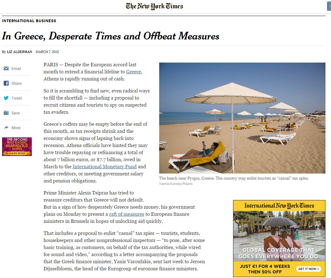 Στην εφημερίδα New York Times αναφέρεται ότι «καθώς εξαντλείται η ρευστότητα, η ελληνική κυβέρνηση αναζητά νέους, ριζοσπαστικούς τρόπους, για να καλύψει το κενό, προσλαμβάνοντας “εποχιακούς φοροκατάσκοπους”. Ο Γενς Μπάστιαν, πρώην μέλος της Task Force της ΕΕ για την Ελλάδα, δήλωσε ότι τέτοιου είδους μέτρα δείχνουν την απελπισία για είσπραξη πόρων».