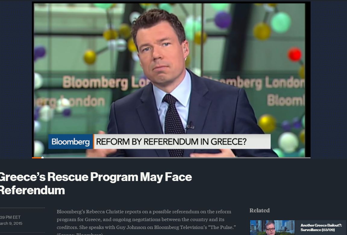 Σε άλλη ανταπόκριση στο Bloomberg γίνεται αναφορά «στο ζήτημα της πρότασης για δημοψήφισμα» σημειώνοντας ότι «σε ξεχωριστές συνεντεύξεις τους στη διάρκεια του Σαββατοκύριακου, οι Έλληνες υπουργοί Οικονομικών και Άμυνας αναφέρθηκαν στην ενδεχόμενη διεξαγωγή δημοψηφίσματος σε περίπτωση που οι πιστωτές απαιτήσουν μέτρα που δεν βρίσκουν σύμφωνη την ελληνική κυβέρνηση. Ο πρωθυπουργός της χώρας δεν έκανε καμία δήλωση αντίθετη στη διεξαγωγή δημοψηφίσματος».