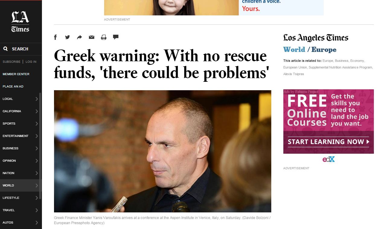 Στην εφημερίδα Los Angeles Times γίνεται αναφορά στις δηλώσεις του υπουργού Οικονομικών Γιάνη Βαρουφάκη ότι «η Ελλάδα θα μπορούσε να προσφύγει σε δημοψήφισμα ή να προκηρύξει νέες εκλογές στην περίπτωση που οι πιστωτές δεν ξεμπλοκάρουν την χρηματοδότηση της χώρας» όπως σημειώνεται στην ανταπόκριση από την Αθήνα.