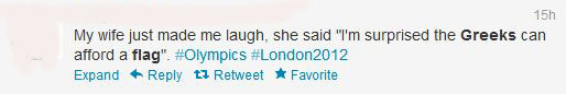 Πλήθος άκομψων σχολίων κατέκλισε χθες βράδυ το twitter, όταν εμφανίστηκε η ελληνική αποστολή στην τελετή έναρξης των Ολυμπιακών αγώνων του Λονδίνου.ΔΙΑΒΑΣΤΕ ΜΕΡΙΚΕΣ ΑΠΟ ΤΙΣ ΑΝΑΡΤΗΣΕΙΣ