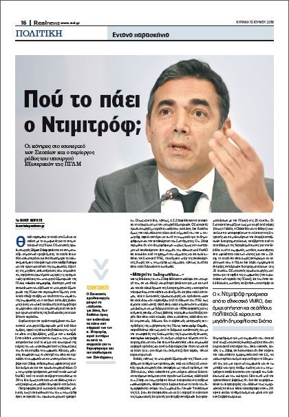 Κάποιοι, μάλιστα, θεωρούν πως το κίνητρό του είναι να τορπιλίσει τη συμφωνία και να υπονομεύσει την κυβέρνηση Ζάεφ, ενδεχομένως υφαίνοντας σχέδια ακόμα και για τον πρωθυπουργικό θώκο. Ο κ. Ντιμιτρόφ προέρχεται μεν από το εθνικιστικό VMRO, από το οποίο ανεξαρτητοποιήθηκε το 2014, έχει όμως απήχηση και σε άλλους πολιτικούς χώρους και μεγάλη δημοφιλία στα Σκόπια.