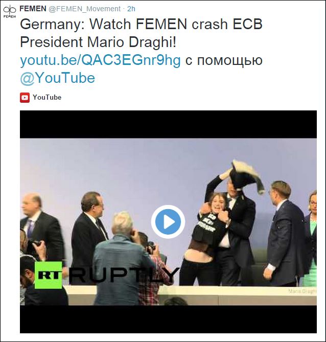 Oι FEMEN ανέβασαν μάλιστα στο Twitter και το βίντεο της επίθεσης κατά τη διάρκεια της συνέντευξης Τύπου του προέδρου της ΕΚΤ.