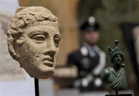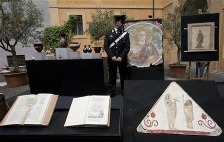 Στα 25 αντικείμενα περιλαμβάνονται ένα ετρουσκικό αγγείο ηλικίας 2.500 ετών, διακοσμημένο με δελφίνια, μια μαρμάρινη σαρκοφάγος που επρόκειτο να πουληθεί από γκαλερί της Νέας Υόρκης έναντι του ποσού των 4,5 εκατομμυρίων δολαρίων και τμήματα τοιχογραφιών που πιστεύεται ότι είχαν κλαπεί από την Πομπηία.