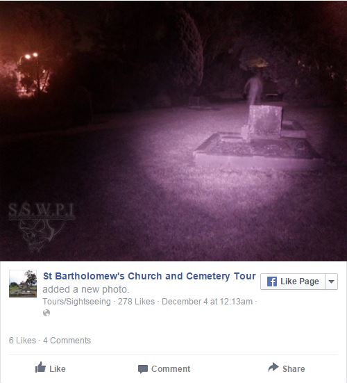 Συγκεκριμένα, τα 4 μέλη της ομάδας «South West Paranormal Investigators» από το Σίντεϊ , υποστηρίζουν ότι πρόκειται για φάντασμα και βασίζουν τον ισχυρισμό τους στο γεγονός ότι η εκκλησία που βρισκόταν κοντά στο νεκροταφείο , η οποία χτίστηκε το 1841 και κάηκε το 1989, θεωρείται στοιχειωμένη.