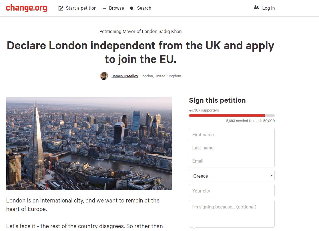 Οι κάτοικοι του Λονδίνου, οι οποίοι τάχθηκαν με την ψήφο τους υπέρ της παραμονής της χώρας στην ΕΕ, μαζεύουν διαδικτυακά υπογραφές για την απόσχιση της βρετανικής πρωτεύουσας από το Ηνωμένο Βασίλειο και την ένταξη της στην Ευρωπαϊκή Ένωση.