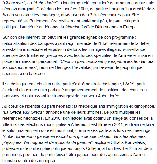 Οι Γάλλοι παρουσιάζουν εκτενές ρεπορτάζ για την άνοδο της Χρυσής Αυγής στην Ελλάδα, σχολιάζοντας πως πρόκειται για μια οργάνωση εθνικιστική και ξενοφοβική, η οποία με κεντρικό της σύνθημα “Η Ελλάδα ανήκει στους Έλληνες” προτείνει να τοποθετηθούν στα σύνορα νάρκες προκειμένου να αποφευχθεί η λαθρομετανάστευση.Η “Monde” προσθέτει ότι ο ηγέτης της εθνικιστικής παράταξης εθεάθη πέρυσι να χαιρετά ναζιστικά στην αίθουσα του Δημοτικού Συμβουλίου του Δήμου Αθηναίων.